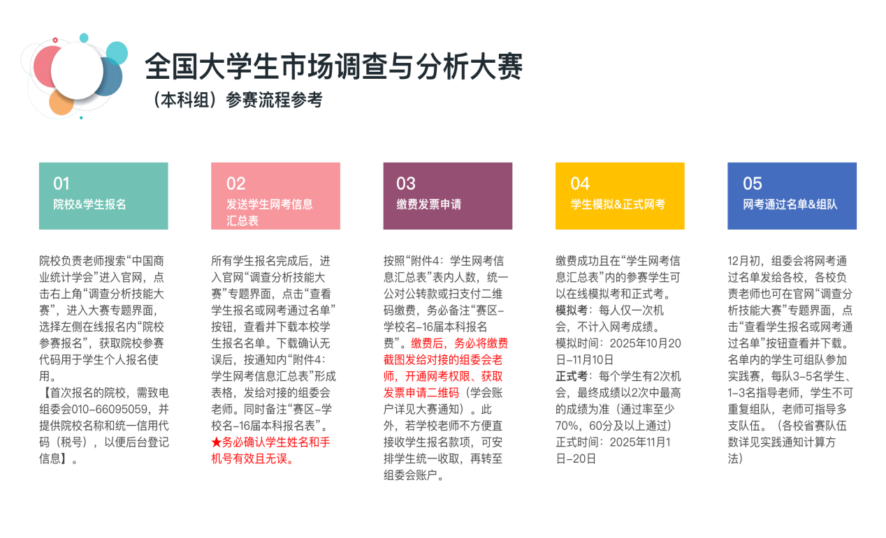 根据省赛组委会要求,市调大赛本科组和专科组参赛报名费30元/人,请参赛同学于2025年10月31日前完成报名,并统一缴纳报名费。报名参加比赛的同学请加入微信群,后续比赛事项将在群内公告,请及时关注微信群消息。